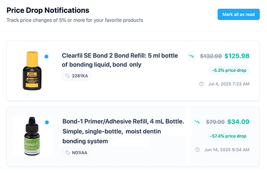 Our platform tracks competitive dental supply pricing from Henry Schein, Patterson, Benco, Darby, and dozens more. When prices drop on products you regularly order, you’re the first to know. No more missing promotions or bulk discounts because you didn’t have time to check. Alara automates what used to take hours — so your team can focus on patients, not procurement.